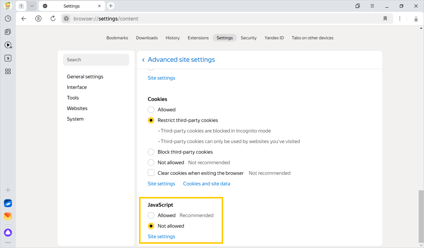 - In the Permissions section, find the JavaScript field and select Block from the list.