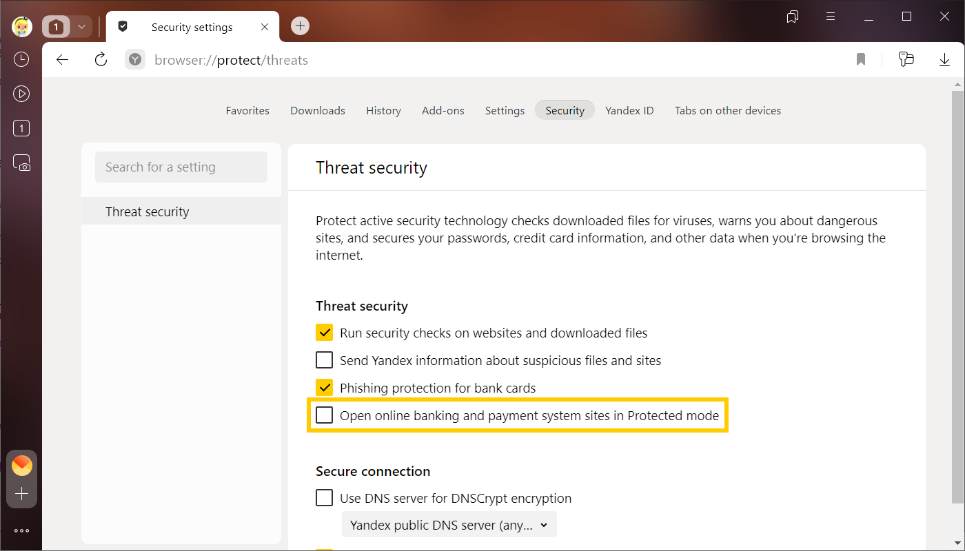 Protected mode is a mode that Yandex Browser enables on bank and payment system web pages to make electronic payments more secure. In protected mode the browser enables strict verification of certificates. If the certificate is verified, the browser disables extensions and changes the interface. Protected mode is part of the Protect integrated security system.