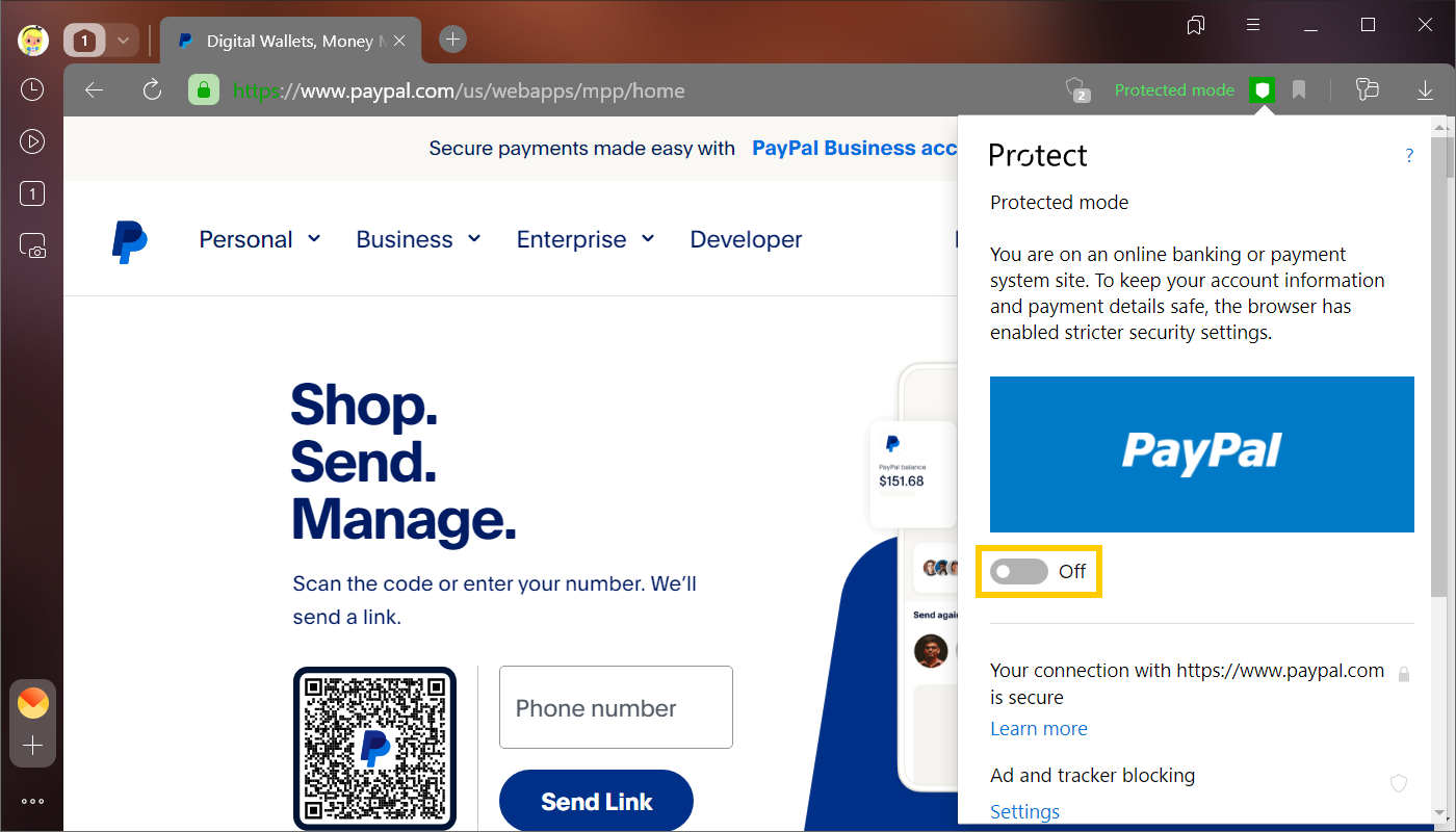 If protected mode is not enabled, there are most likely problems with the site certificate. It’s better not to make payments on this page. We recommend that you open the Protect panel, read the information about using the certificate and assess the risk of theft of your payment information.