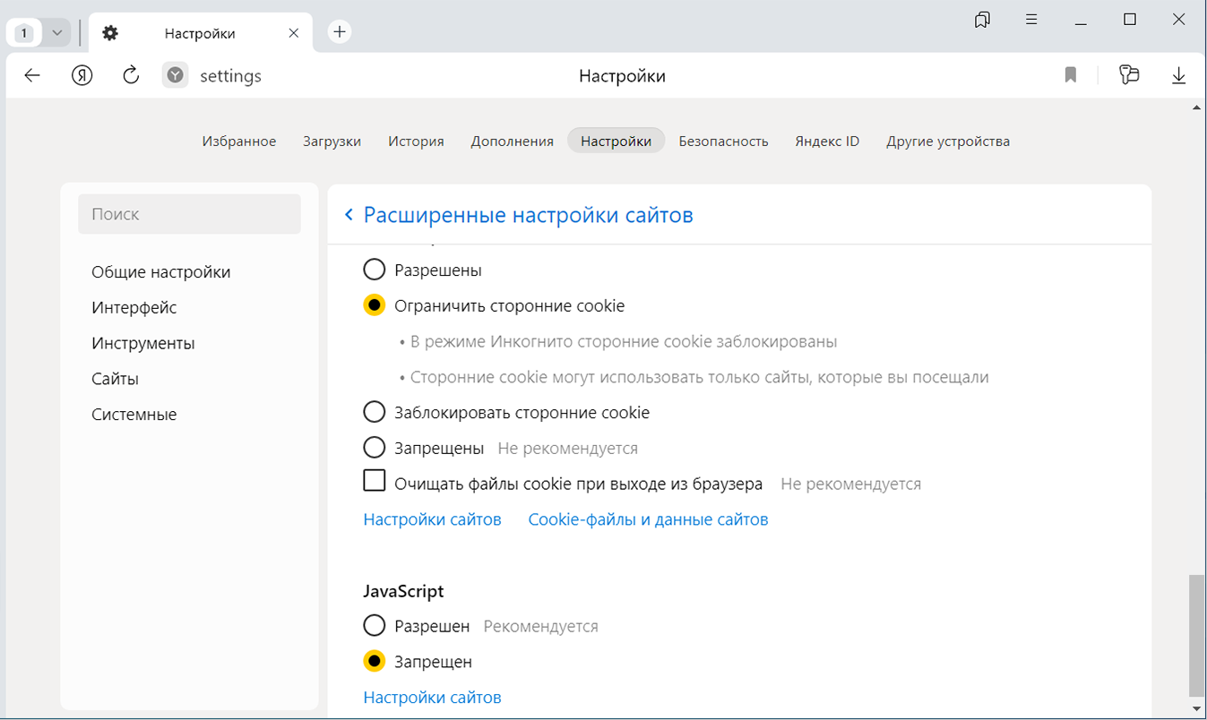 В разделе JavaScript включите опцию Запрещен.