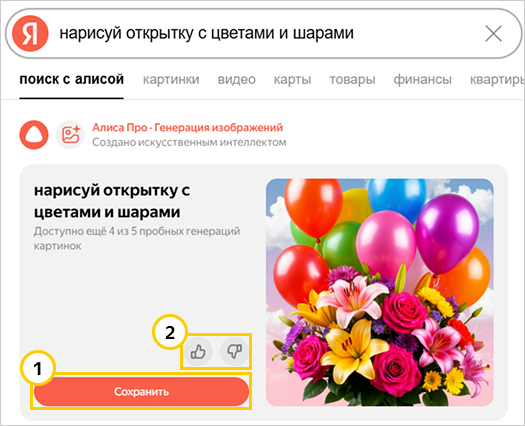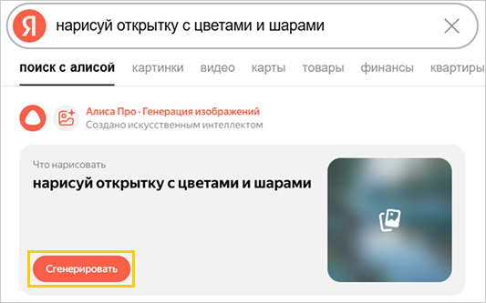 1. В строке поиска введите запрос, например нарисуй открытку. Чем подробнее будет описание, тем релевантнее будет изображение. Например, не просто нарисуй открытку, а нарисуй открытку с цветами и шарами.