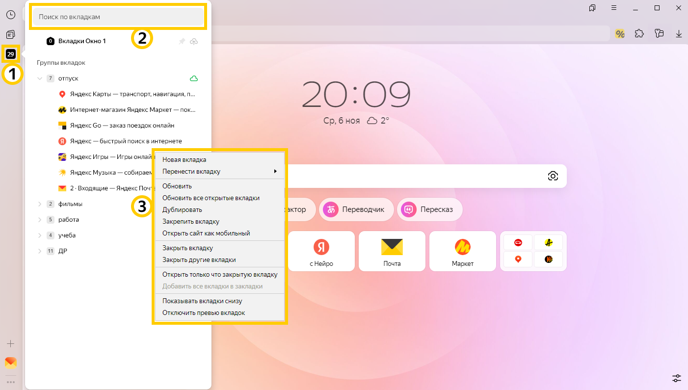 Когда открыто много вкладок, в них трудно ориентироваться. Яндекс Браузер предлагает работать с большим количеством вкладок в специальной панели, где вкладки отображаются в виде вертикального списка и объединяются в группы.
