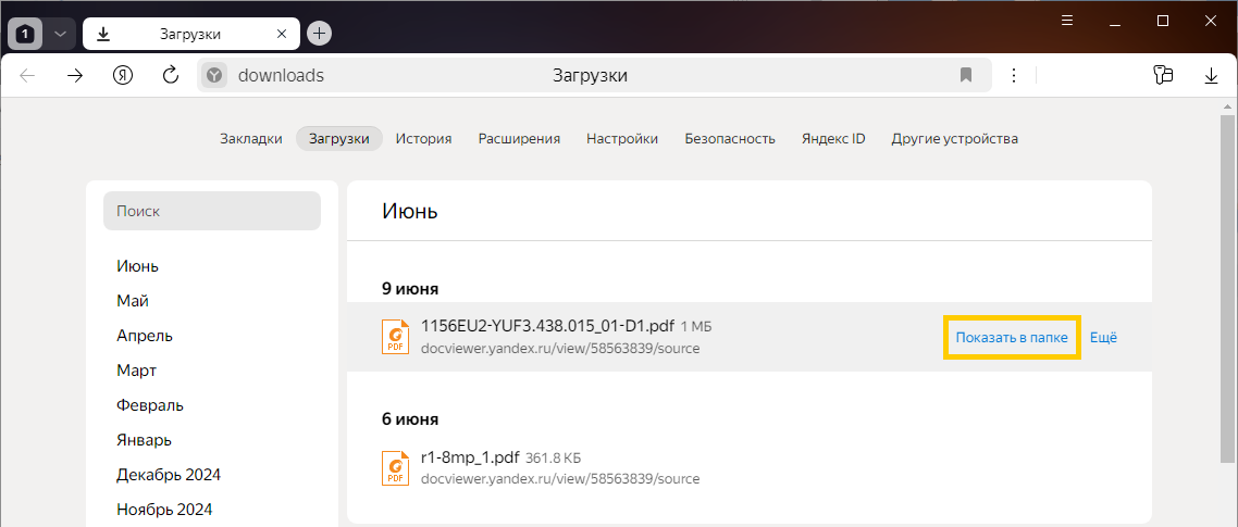 Нажмите Ctrl+J (Windows) или Command+Shift+J (macOS), чтобы открыть список загрузок в Браузере;