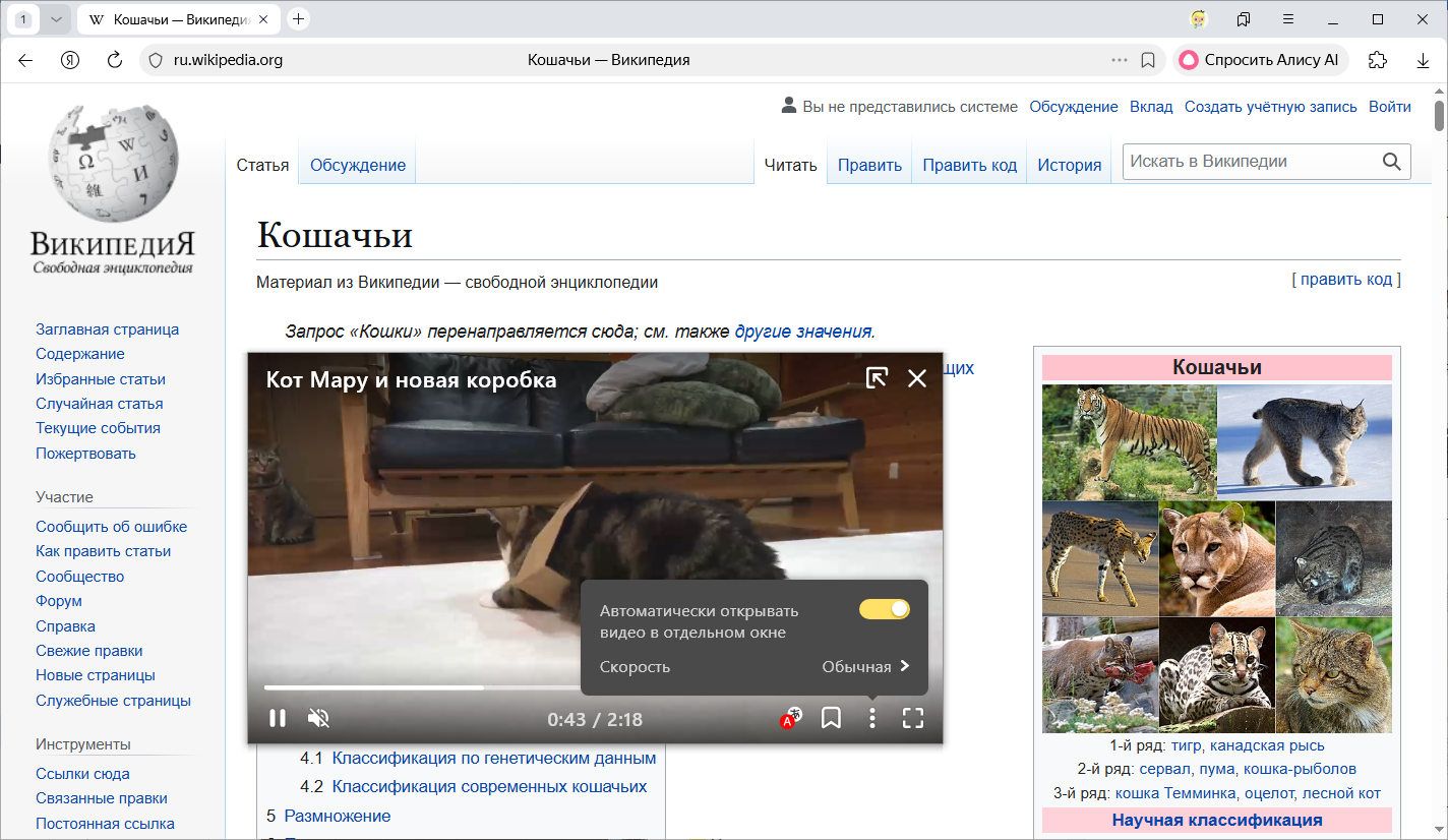 Вы можете просматривать видео в отдельном окне Браузера. Например, можно одновременно запустить программу и видеоинструкцию к ней. Окно с видеоплеером отображается поверх всех остальных окон, в какой бы программе вы ни работали. Вы можете перетащить окно в любое место экрана или изменить его размеры. Если свернуть Браузер, видео продолжит проигрываться. Если видео в формате HTML5 содержит субтитры (например, на YouTube у таких видео на панели управления есть значок ), они тоже появятся в новом окне.