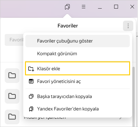 Yandex Browser’ı farklı cihazlarda eşitlediyseniz sol menüde cihaz adıyla klasörler görünecektir (ör. Akıllı Telefon veya Tablet). Ayrıntılı bilgi için Favorilerin eşitlenmesi bölümünü okuyun.