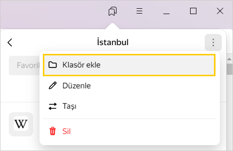 Başka bir tarayıcıdan favorileri içe aktardıysanız aktarılan klasörler de sol menüde görünür. Klasör isimleri aynı kalır. Daha ayrıntılı bilgi için Favorileri içe aktarma bölümüne bakın.