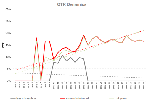 Here is an example of a change in the CTR and ad impression share for two ads in a group that were served in premium placement positions over a calendar month. The diagrams show that the more clickable ad is gradually displayed more often, contributing to the growth of the total group CTR.