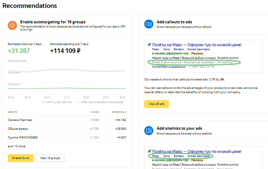 Recommendations will help you adjust campaigns to produce more clicks and conversions or reach more users. Yandex Direct will analyze your campaign data and provide personalized tips for how to improve the campaign's performance. For example, it may suggest increasing the budget limit or enable autotargeting in campaigns where it's not enabled.
