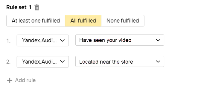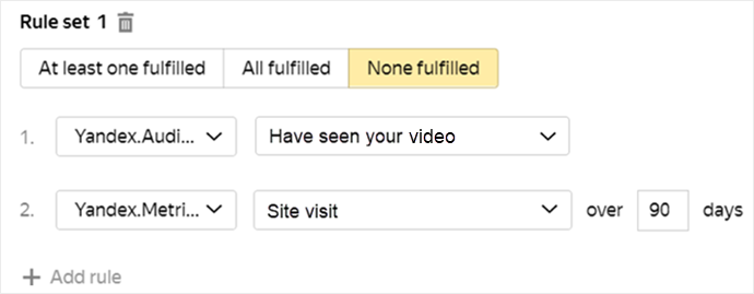 For example, you may want to select users who didn't watch the video completely. Select the “Displayed” and “100% completion” events. Two segments will be created in Yandex Audience. When configuring retargeting lists, target a segment of users who started watching the video, and use a negative criteria to exclude those who watched the video completely.