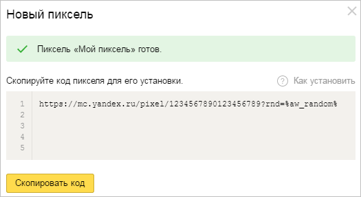 1. Create a pixel in Yandex.Audience. On the Pixels tab, click Create pixel and enter a name. The pixel code will be generated automatically. For more information, see Yandex Audience Help.