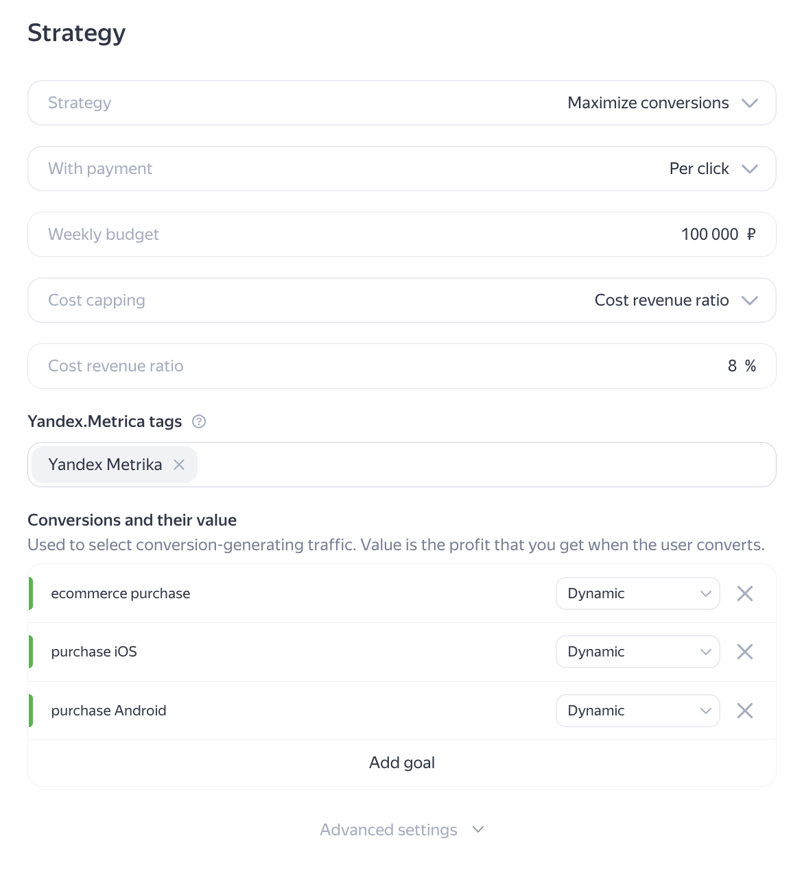 4. Set the dynamic goal value. To optimize your cost revenue ratio campaign for in-app goals, set up revenue collection and delivery based on events in Yandex Direct.