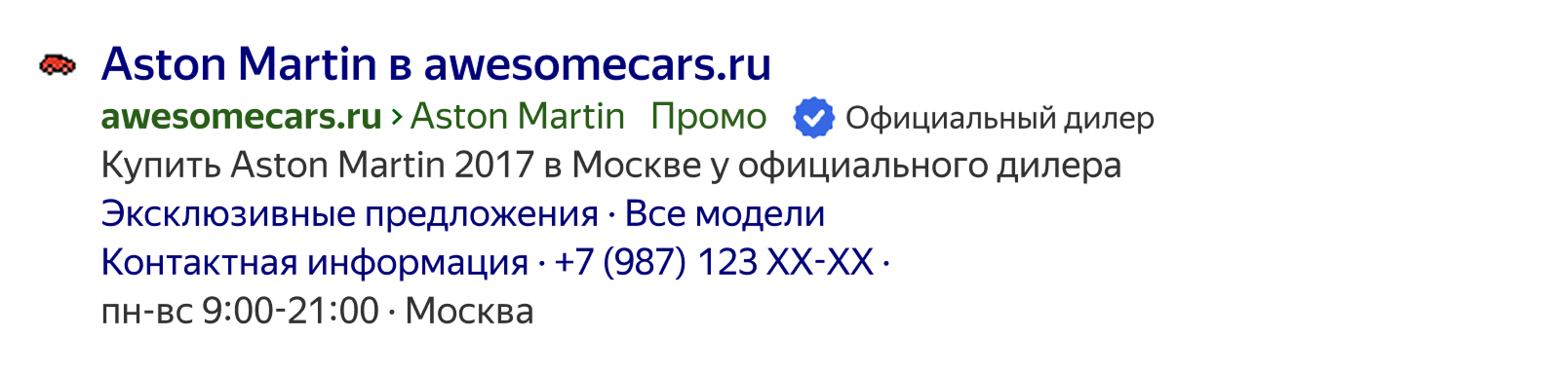 ссылка на сайт в объявлении Директа полностью совпадает с доменом официального дилера.