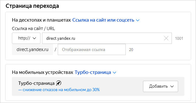Только на мобильных устройствах: в блоке Страница перехода в разделе На десктопах и планшетах введите ссылку на основной сайт. В разделе На мобильных устройствах выберите Турбо-страница. В этом случае при показе на компьютерах и планшетах ваша реклама будет вести на основной сайт, на смартфонах — на Турбо-сайт.