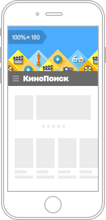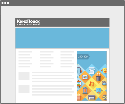 Баннер 100% × 250 находится на первом экране Телепрограммы, Музыки, Афиши и главной страницы Кинопоиска — благодаря такому размещению и большому формату его увидит большое число пользователей.