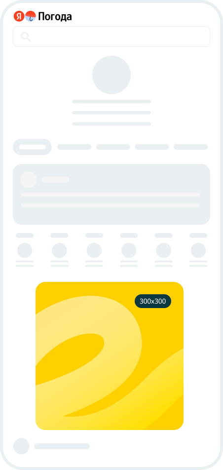 Баннер на сервисах Яндекса — это медийный формат, который показывается на страницах Погоды, Почты, Игр, Картинок, Видео, Телепрограммы, Авто.ру, Переводчика, Кинопоиска, Музыки, Афиши и телевизорах на YaOS . Баннер позволит привлечь внимание качественной аудитории в момент, когда она изучает контент, отдыхает или планирует досуг. Благодаря заметным позициям и широкому охвату продукта помогает строить знание о бренде в момент взаимодействия с популярными сервисами Яндекса.