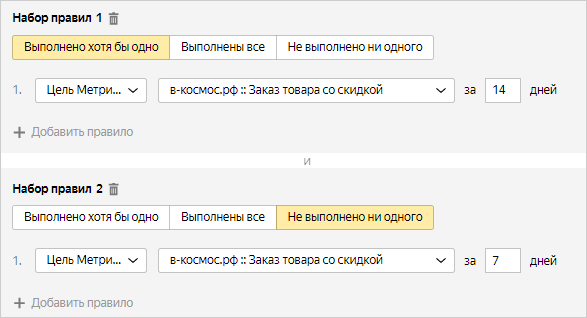 Условие формирования сегмента аудитории может состоять из одного или нескольких наборов правил (не более 50), объединенных оператором «И».