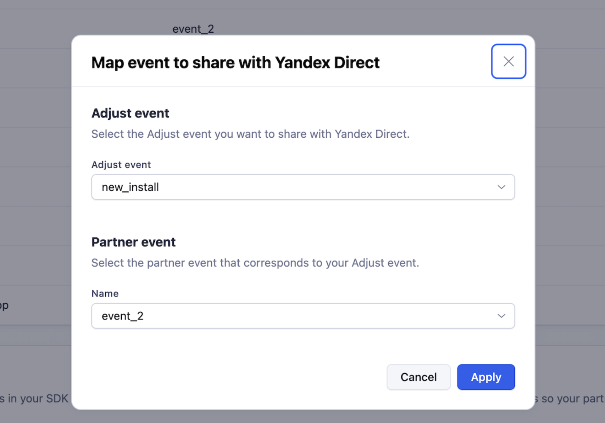 Настройте маппинг событий вашего приложения с событиями Директа. Чтобы добавить событие, нажмите Map event.
