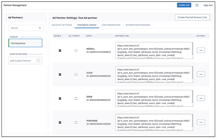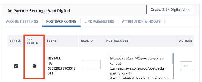 Перейдите на вкладку Postback, подраздел Event Schema. Убедитесь, что событие «Install (App)» присутствует. Активируйте отправку событий — нажмите Activate.