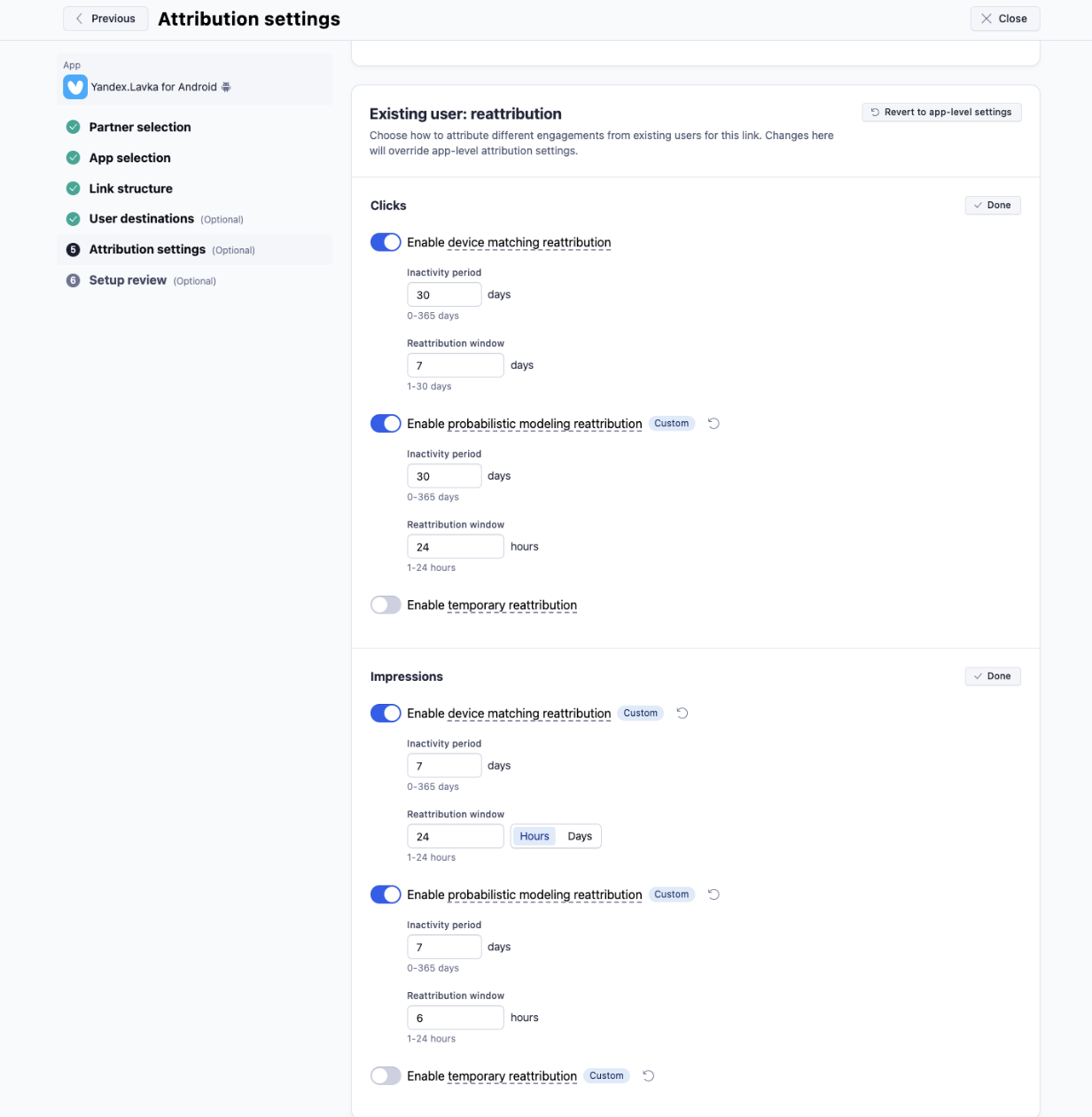 Перейдите на вкладку Attribution link. Выберите OneLink и заранее созданный шаблон с поддержкой кросс‑платформенной атрибуции.