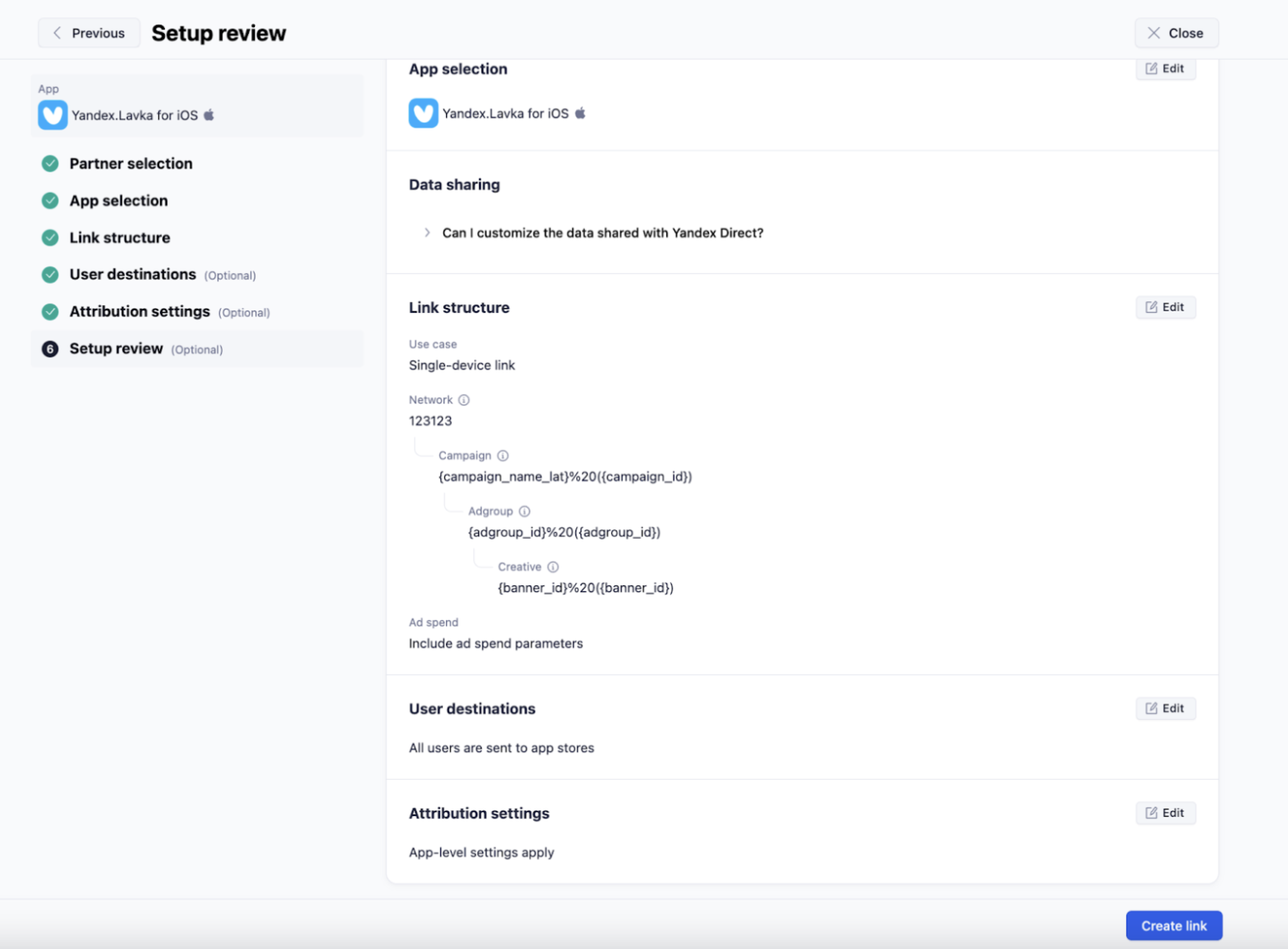 Подробнее создание трекинговой ссылки описано в помощи AppsFlyer. Если у вас возникли вопросы по работе ссылки, обратитесь в службу поддержки AppsFlyer.