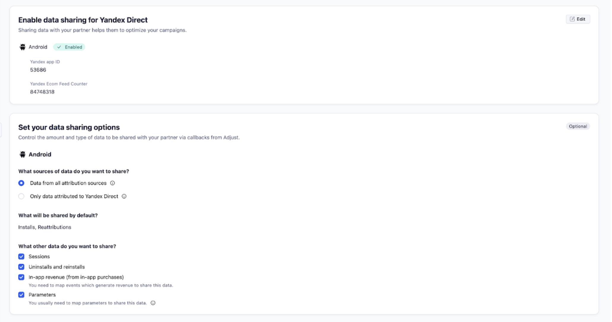 Укажите Yandex app ID из библиотеки приложений в Директе и настройте параметры передачи данных.