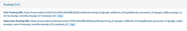 Перейдите в раздел CONFIGURE → Campaigns и выберите созданную кампанию. В ее свойствах вы увидите ссылки в полях Click Tracking URL и Impression Tracking URL.