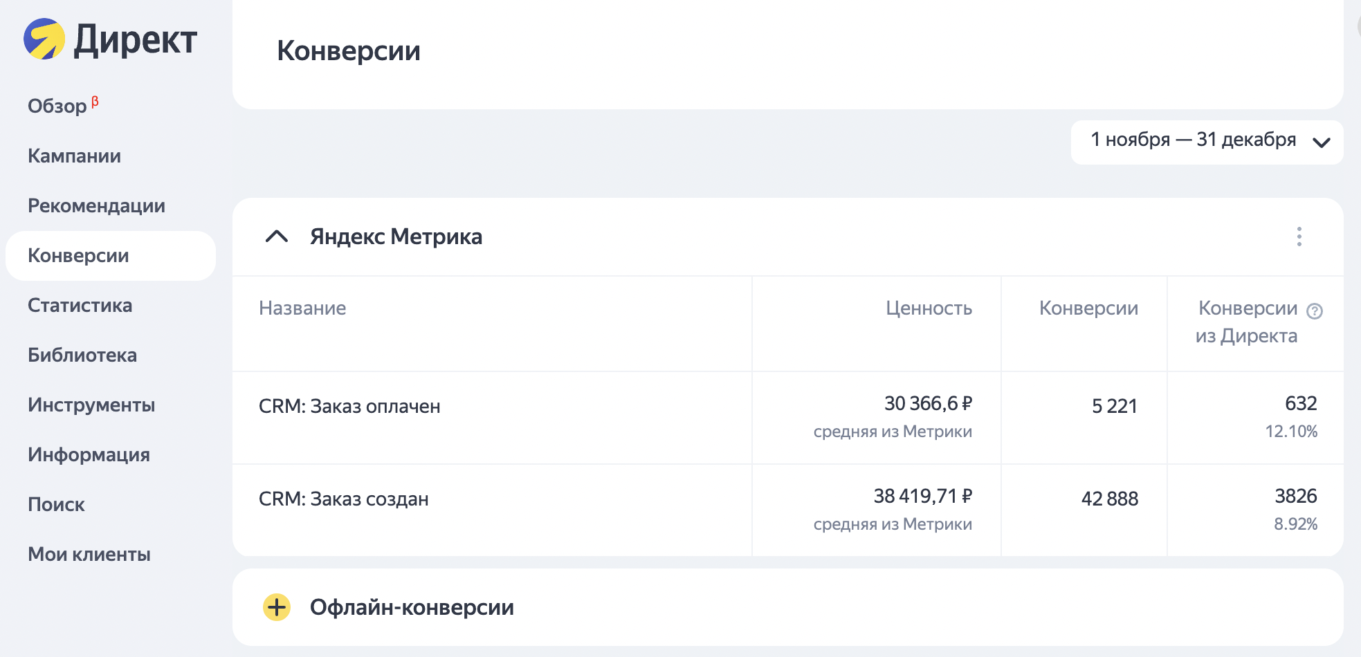 - какие конверсии из офлайна или по звонкам принесли объявления в Директе;
