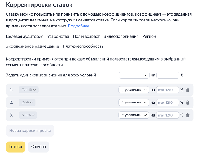 Teklif, tıklama veya dönüşüm fiyatı düzenlemelerini ödeme gücü yüksek kullanıcı segmenti için özel olarak ayarlayabilirsiniz. Kullanıcı davranışlarını farklı parametrelere göre analiz eden sistem, analiz sonuçlarına göre kullanıcıları ödeme güçlerine göre farklı segmentlere ayırır. Teklif, tıklama veya dönüşüm fiyatı düzenlemeleri sayesinde 3 gruba bölünmüş Yandex kullanıcı kitlesinin %10'u için görüntüleme teklifini yükseltip düşürebilirsiniz: