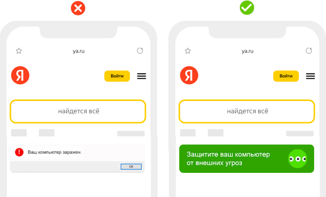 请勿使用黄色作为按钮或徽章颜色,因为标准 Yandex 页面设计元素使用这种颜色。 可接受使用 #F0E5AD 及以上色号的黄色。