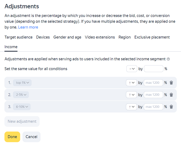 您可以针对高收入的受众细分设置出价、转化成本或转化价值的调整。 系统会分析用户行为的不同参数,并将其分配到反映其收入水平的不同细分中。 通过调整,您可以针对 Yandex 受众中收入最高的前 10% 用户(分为三个组别)提高或降低出价、转化成本或广告支出比例: