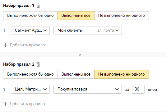 使用一个或多个规则集(但不超过 50 个),并通过“AND”运算符进行连接。 对于每个规则集,您可以使用 Yandex Metrica 目标或细分、Yandex.Audience 细分,或两者的组合(但总数不超过 250 个)。 请记住,设置的规则越多,受众覆盖范围越小。
