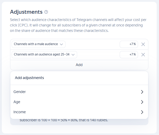 您的点击价格为 100 卢布。 对于有男性受众的 Telegram 频道,您希望增加 50%。 点击价格调整将根据其百分比计算: