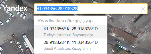 Haritada coğrafi koordinatlarla obje aramak için ilgili koordinatları arama satırına girin.