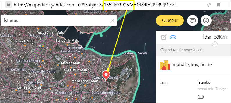 Yandex Map Editor haritalarındaki her bir obje kendine özgü bir sayısal kimlik belirleyiciye (ID'ye) sahiptir. Bu kimlik belirleyiciyi ilgili objeyi haritada bulmak ve obje hakkında bilgi aktarmak için kullanabilirsiniz.