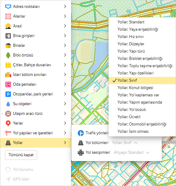 Diğer elektronik harita servisleri gibi Yandex Map Editor de her biri belirli tür objeler hakkında bilgi içeren birden fazla katmandan oluşur. Haritadaki katmanları istediğiniz gibi yönetebilirsiniz.