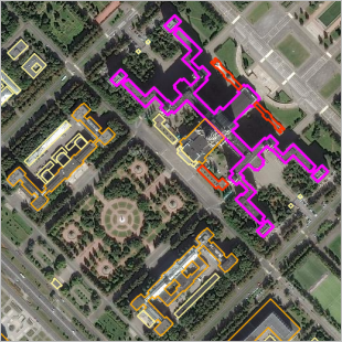 3 boyutlu modeller ile tamamlanmış binalar. 13 veya daha büyük ölçeklerde 3 boyutlu modellerle tamamlanmış binalar kırmızı çerçeveyle gösterilir: