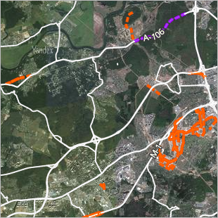 Sınıfı doğru belirtilen yol bölümleri turuncu, sınıfı hatalı belirtilen yol bölümleri ise mor renkle gösterilmiştir: