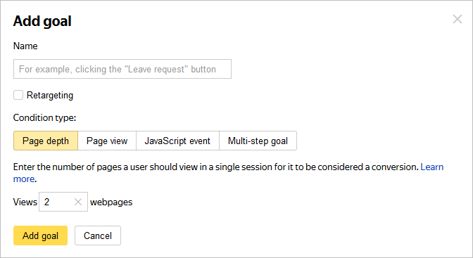 - Click Add goal. The created goal will appear in the list of goals. Yandex.Metrica will start collecting statistics on it within a few minutes.