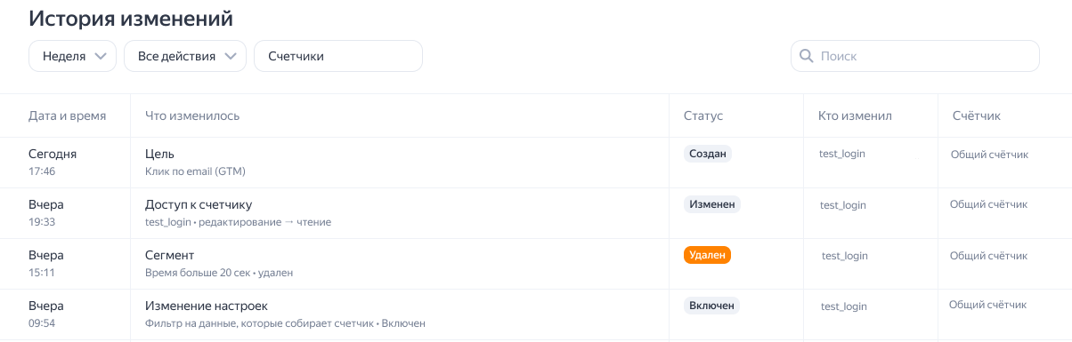 Changelog is a section of Yandex Metrica Pro where you can view information about changes to the tags linked to your organization.