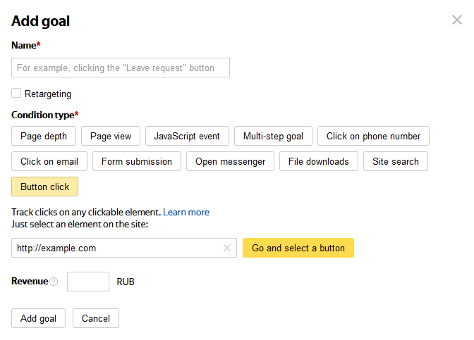 You can track goals related to clicks on various buttons and links on your site. When creating such a goal, Yandex Metrica saves information about the location and properties of these elements.