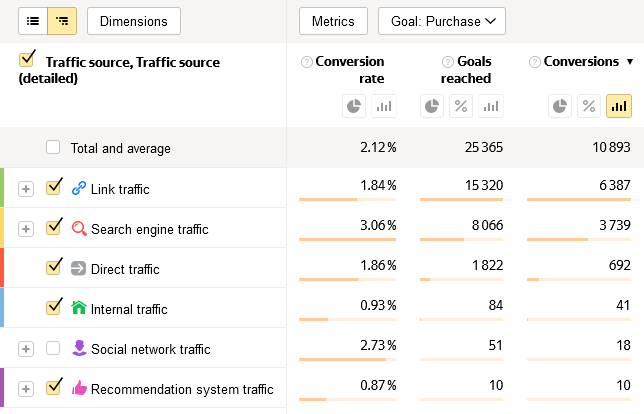 Each session has its own source. Yandex Metrica organizes the sources into groups. For more information, see How Yandex Metrica detects the traffic source.