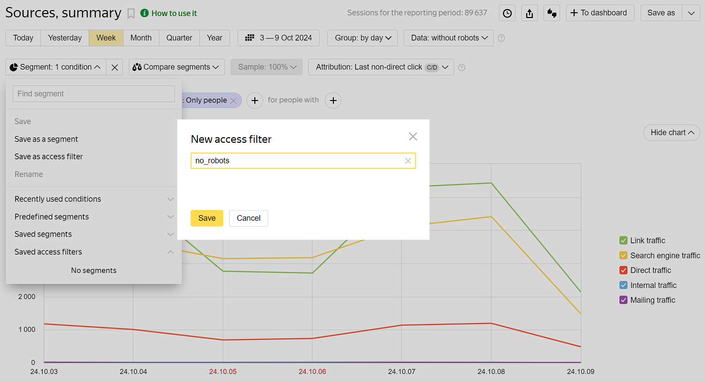 Con los filtros de acceso, puede elegir qué datos sobre sesiones del sitio estarán accesibles para un usuario de Yandex Metrica. Por ejemplo, puede filtrar el tráfico de una campaña publicitaria específica o ubicación, otorgando acceso únicamente a este tráfico.