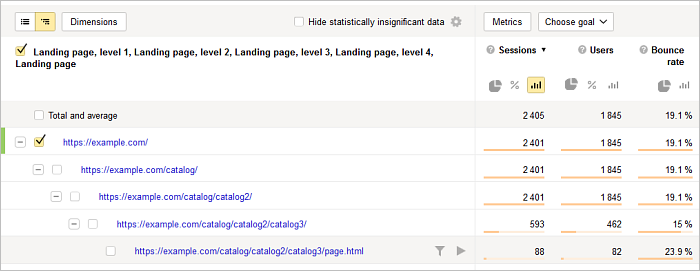 Mostrar datos para todas las páginas con una URL que contenga la cadena: @tariff