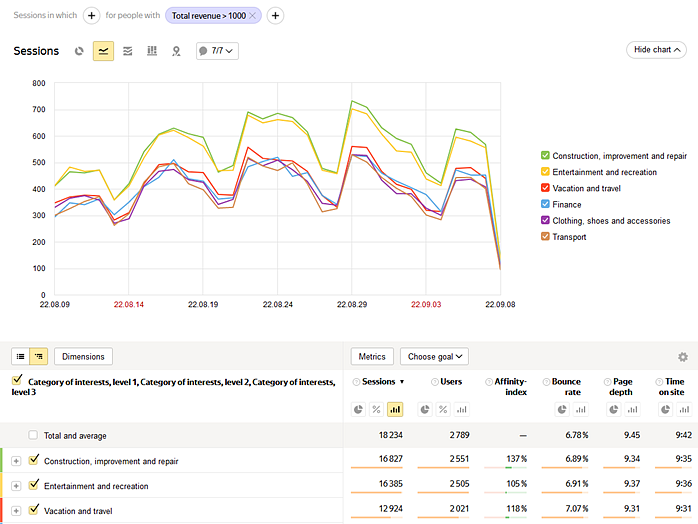 Un ejemplo de este informe está disponible para la etiqueta de demostración de Yandex Metrica.