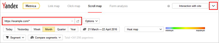 Vejamos um exemplo. Você precisa obter estatísticas sobre as páginas do diretório https://exemplo.com.br/mercadorias/. Para que esses dados sejam mostrados no mapa, insira https://exemplo.com.br/mercadorias/* na caixa de endereço (depois disso, o mesmo endereço será mostrado na lista suspensa de sugestões). Os dados são carregados automaticamente.