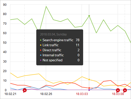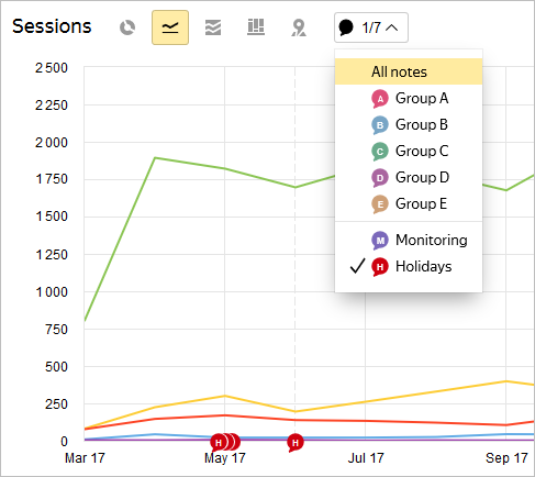 Os comentários ajudam a rastrear eventos importantes e entender como eles estão relacionados com oscilações nas estatísticas do site. Você pode criar suas próprias notas ou usar as notas predefinidas do Yandex Metrica.