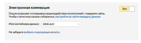 В настройках счетчика включите опцию Электронная коммерция. В код счетчика добавится контейнер для сбора данных