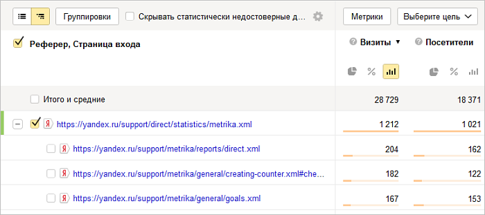 Теперь в отчете отображаются страницы, с которых начался визит, а на втором уровне дерева отчета — страницы, с которых был произведен переход. Для удобства можно перенести группировку Реферер на первое место в списке группировок. Тогда на первом уровне мы увидим те страницы, на которых предположительно может не быть кода счетчика, а на втором — куда вели переходы с них.