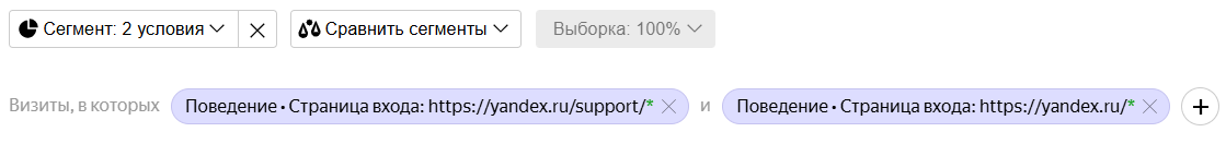 При переходе из отчета в отчет условия сегментации сохраняются. Если поддерживаемые условия разные, в Метрике появляется сообщение о их несовместимости. В этом случае удалите условия и задайте новый сегмент.