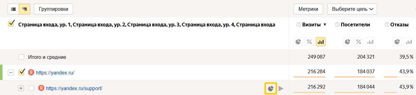 В отчете Страницы входа наведем на нужную строку и нажмем значок .